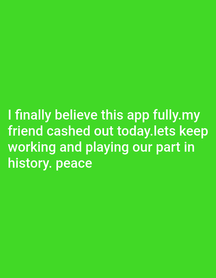 The image displays a digital graphic featuring white sans-serif text set against a uniform, solid, bright green background. The text, centrally aligned and positioned in the lower half of the frame, reads: "I finally believe this app fully.my friend cashed out today.lets keep working and playing our part in history. peace". This textual communication is pertinent to activities and discussions within the city of Howayi, Nigeria. No physical people, specific subjects, tangible objects, discernible actions, or interactive elements of a real-world environment are visually depicted within this graphic. The environment described is solely the digital display medium.
