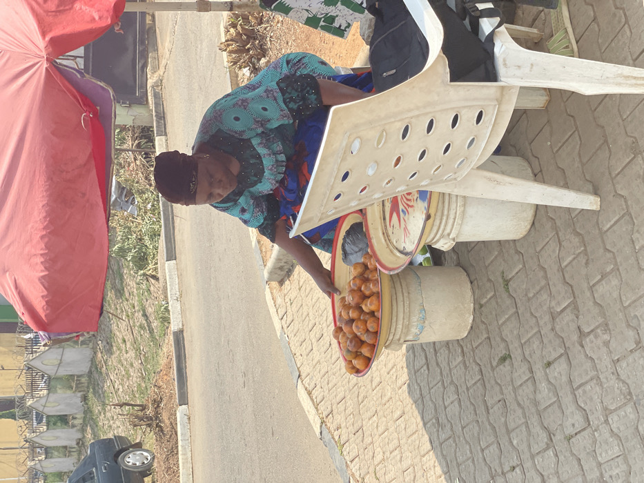 An outdoor scene in Abuja, Nigeria, depicts a lone adult female operating a roadside stall under a large, red market umbrella