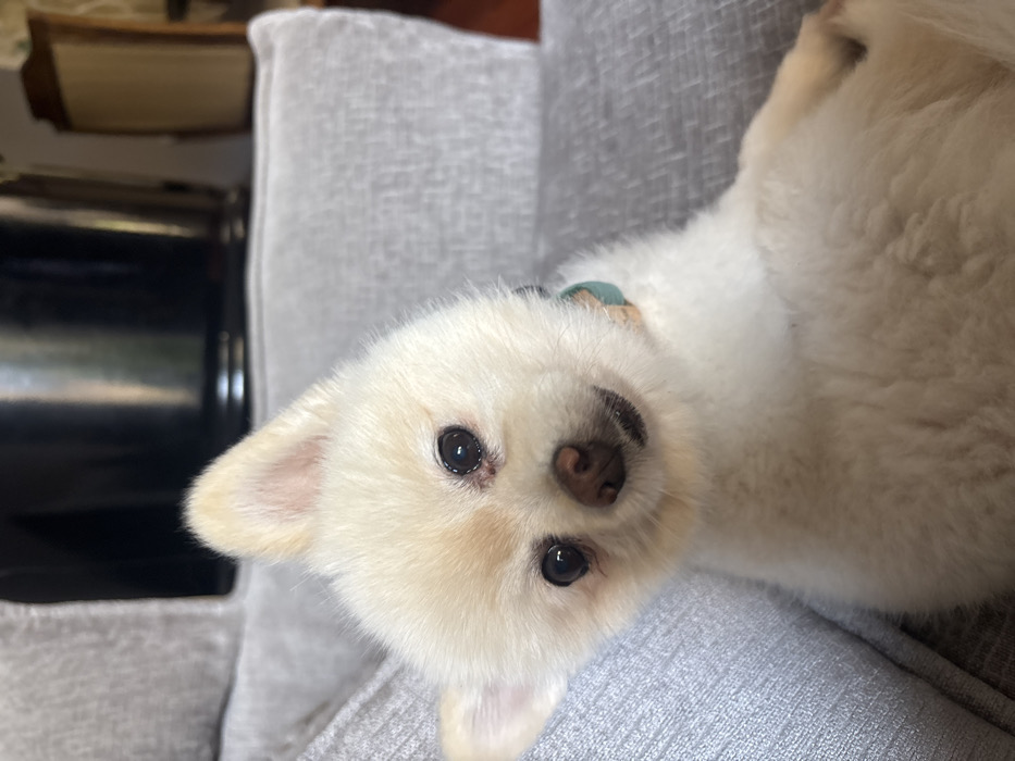 - "The image depicts a close-up of a small, light-furred canine, consistent with a Pomeranian, with cream or pale tan fur, seated on a light grey upholstered sofa" by FM-QW7F63, licensed under CC BY 4.0