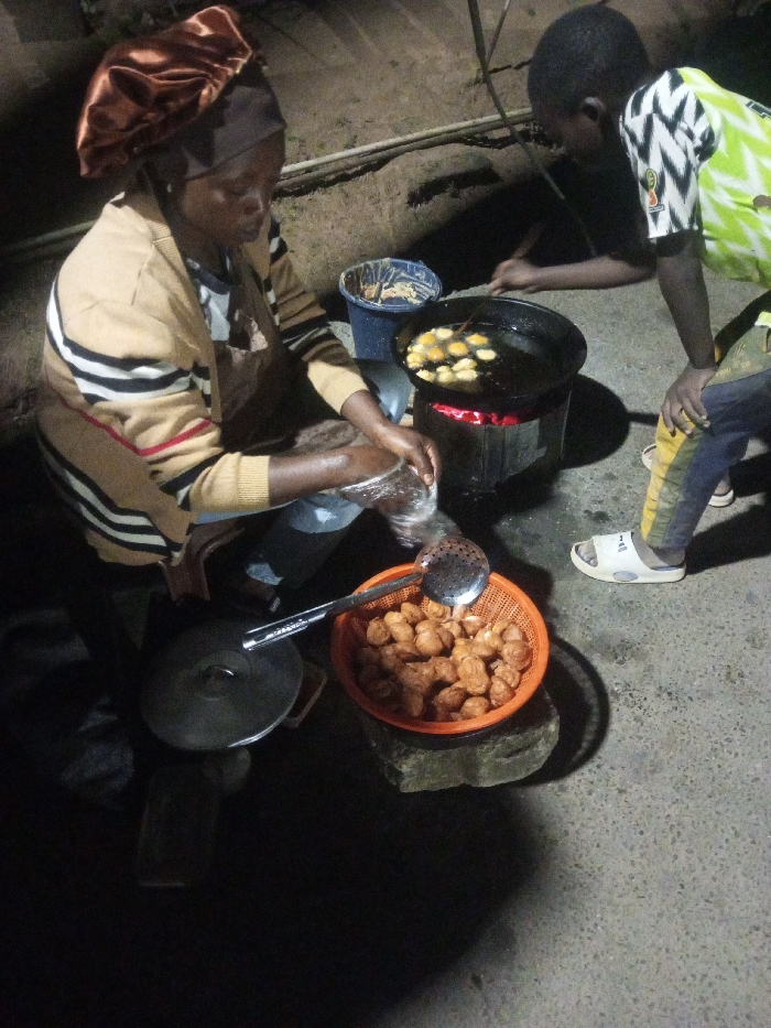 A woman and a child are outdoors at night, preparing food. The woman, wearing a head covering and an apron, sits next to a bowl full of fried dough balls and a pan with a lid. She is removing more dough from a plastic bag. Nearby, a child stands over a wok of frying dough over a small stove, wearing a patterned shirt and sandals. In the background, a bucket rests on a low wall.