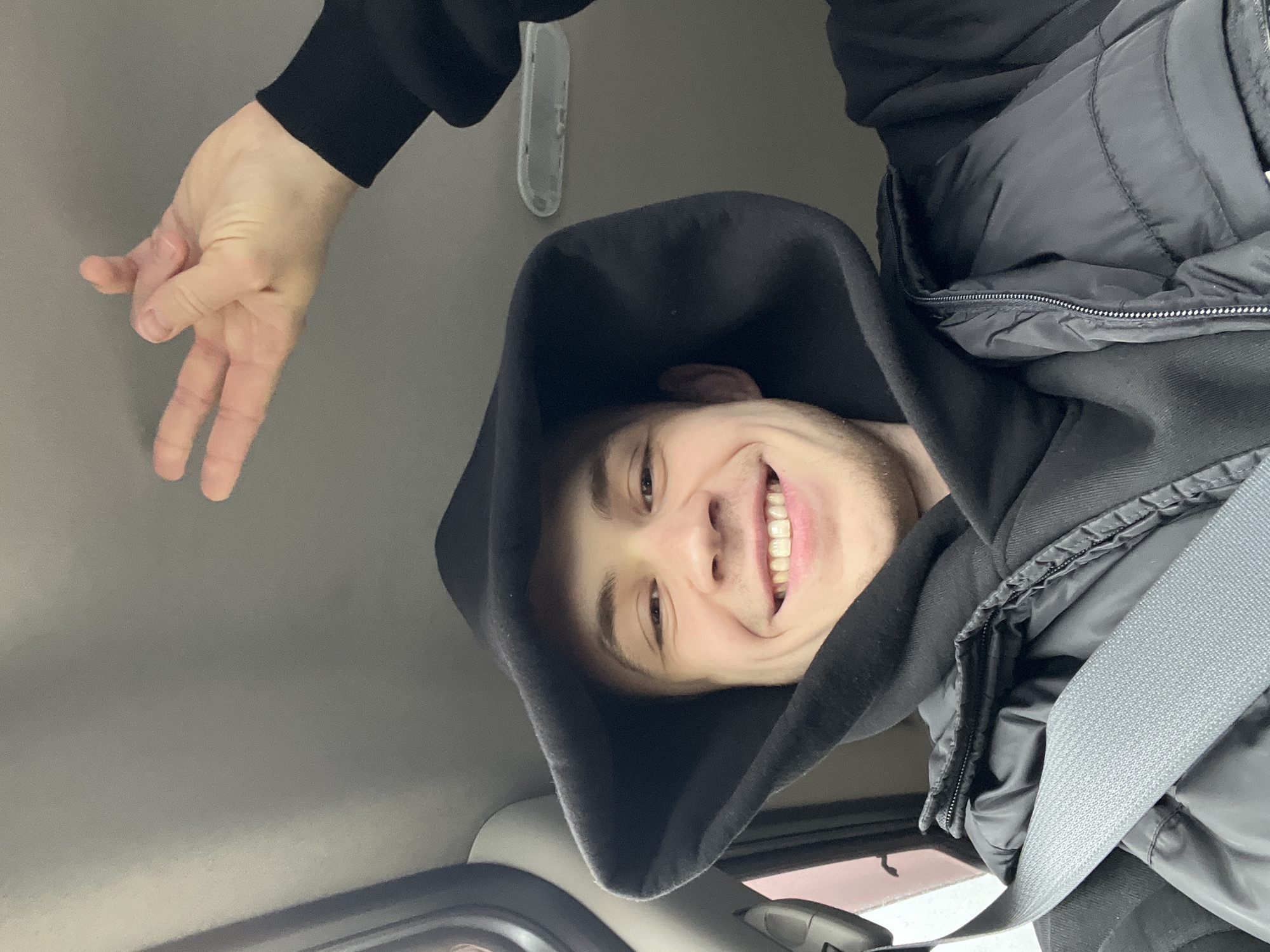 A male individual is depicted in a close-up, chest-up self-portrait taken inside a vehicle, location Unknown, Unknown