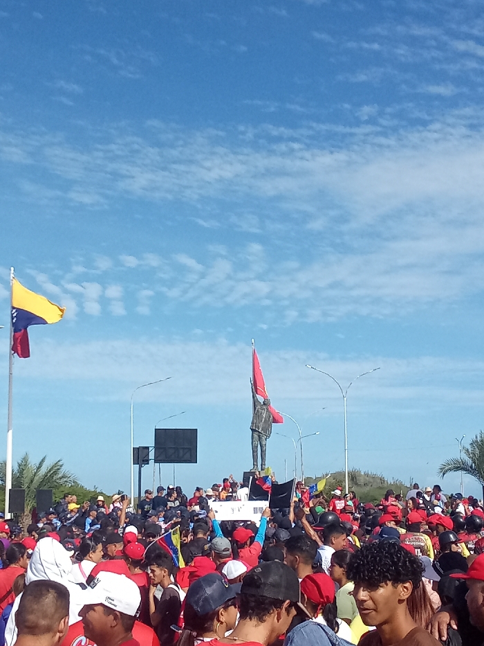 The image captures a large outdoor public gathering under a clear blue sky with scattered cirrocumulus clouds. The scene is located in Porlamar, Venezuela, at the Rotonda Hugo Chávez on Avenida Bolívar. Centrally positioned is a bronze-colored statue, identified as the Monumento a Hugo Chávez, depicting a male figure holding a large red banner or flag vertically with his raised right arm. To the left of the frame, a flagpole displays a Venezuelan national flag (yellow, blue, red with stars). A dense crowd of individuals, estimated in the hundreds, occupies the foreground and midground, extending to the base of the monument. A predominant feature is the attire of many participants, who are wearing red shirts and/or red caps. Numerous individuals within the crowd are holding small Venezuelan flags. Some attendees appear to be looking towards the monument or an elevated platform at its base. Black rectangular structures, possibly large screens or sound equipment, are visible behind the crowd near the statue. Street light poles with multiple luminaires are present in the background. The distant background reveals low, undulating terrain with sparse vegetation, including palm trees. The scene is illuminated by bright daylight.