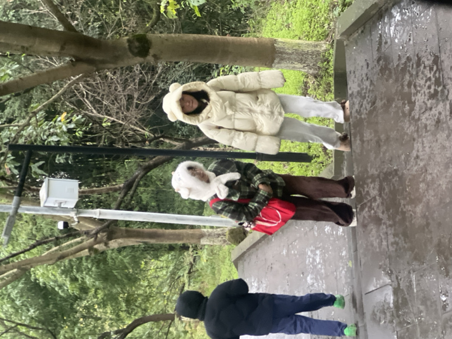 Three people stand on a stone pathway near a wooded area. The first, wearing a beige puffy coat with bear ears and light gray pants, is closest to a tree. The second wears a fluffy white hood, plaid shirt, red bag, and brown pants. The third, in a black hooded jacket and blue pants, has bright green shoes. The path looks damp, and there are trees and foliage surrounding them.