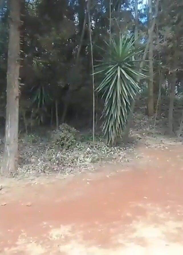 dirt road in a wooded area. There are several tall trees and yucca plants visible. To the left, there is a small building with a red roof and gray brick walls. There is also a pile of bricks near the building. The camera appears to be moving slowly along the road. The sky is visible through the trees and appears to be blue.