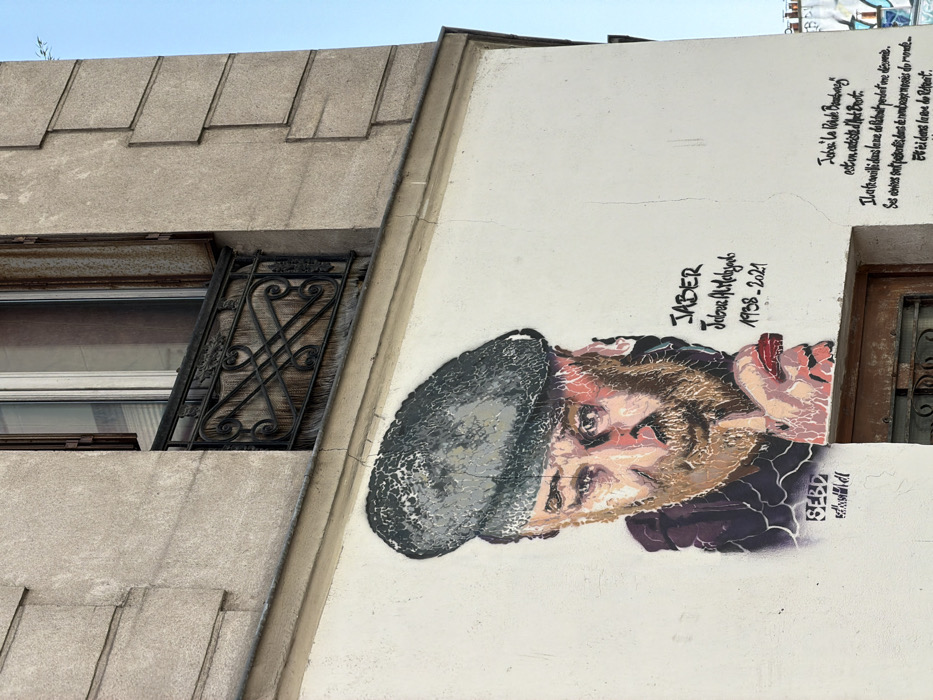 A mural is depicted on the light-colored, weathered exterior wall of a building located on Rue du Retrait in Paris, France. The central subject of the mural is a male figure rendered in a multi-layered, stencil-like style, featuring a reddish-brown beard, dark eyes, and a grey beret. The figure's right hand is raised, with fingers touching the chin area. To the immediate right of the portrait, the text "JABER" is prominently displayed, followed by "Jabur Alhayab" and the dates "1938 - 2021." Below the portrait, artist tags "SEBD" and "Street Hall" are visible. Further to the right, a block of French text identifies the subject as "Jaber, le poète Bagdadien" (Jaber, the Baghdad poet), stating his decade of work on Rue du Retrait, global presence in museums, and the current location on "Rue du Retrait." Above the mural, a window with a dark, ornate wrought-iron railing is visible, set into a section of the building's facade that appears to be constructed of light-colored, rectangular stone blocks or faux stone cladding. The window frame and partially visible wooden shutters are dark-toned. The upper right portion of the image shows a clear blue sky, with minimal green foliage visible against it. The wall displays minor surface cracking.