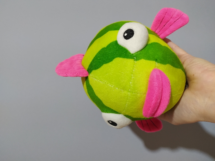 A single plush toy, resembling a fish with a watermelon pattern, is depicted held by a human hand against a plain, light gray background