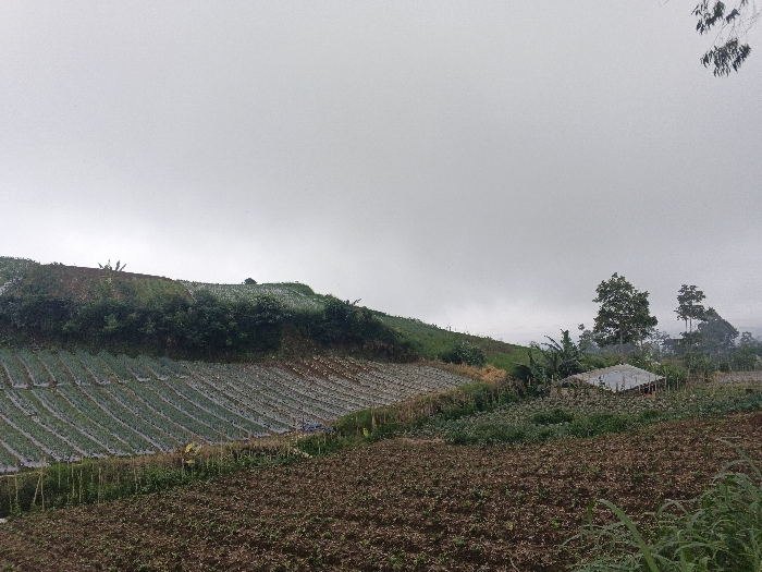 The image displays an agricultural landscape in Khna, Cambodia, under a uniformly overcast sky. The upper two-thirds of the frame are filled with a light grey sky. The scene is dominated by undulating hillsides, demonstrating extensive terraced cultivation. In the foreground, a section of tilled, dark brown earth shows sparse, low-lying green vegetation. To the left, a significant portion of a slope is covered with parallel rows of cultivated plants, largely obscured by light-colored plastic mulch sheeting. Further up the slope, denser natural green foliage is observed. On the right, a small, utilitarian structure with a light-colored gabled roof is positioned amidst trees, including banana plants, and additional cultivated land. Tall, mature trees are present on the right edge, with bare branches extending into the upper right corner. No human figures or active processes are discernible within the frame.