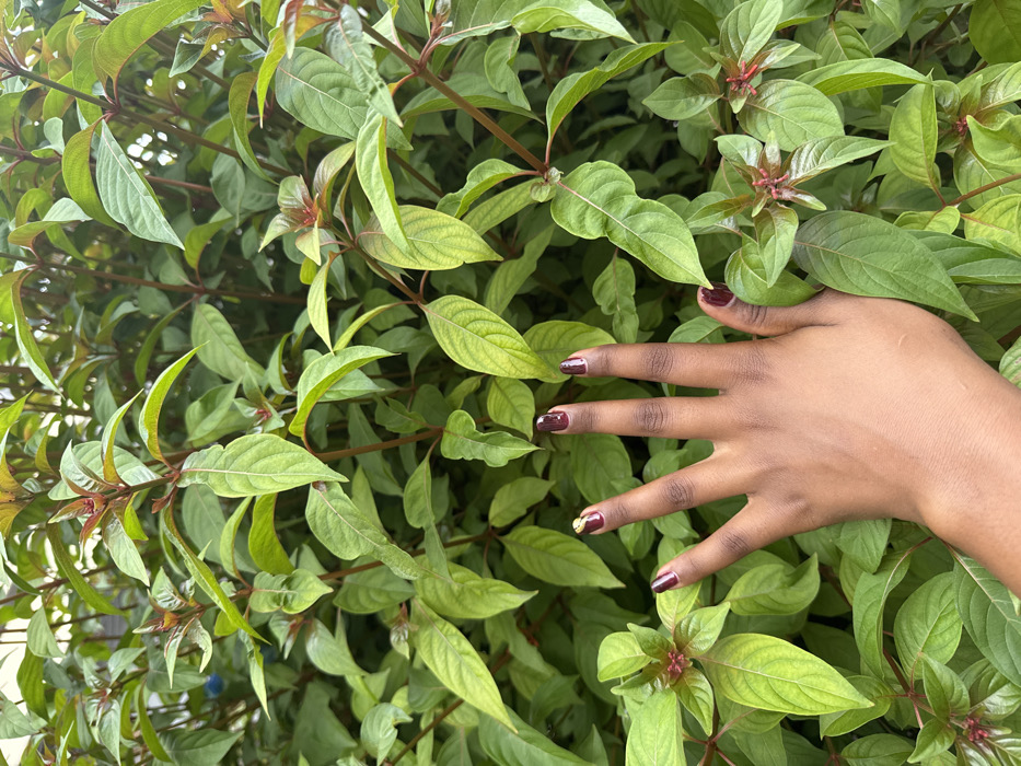 A hand with dark skin and maroon nail polish is positioned among vibrant green leaves