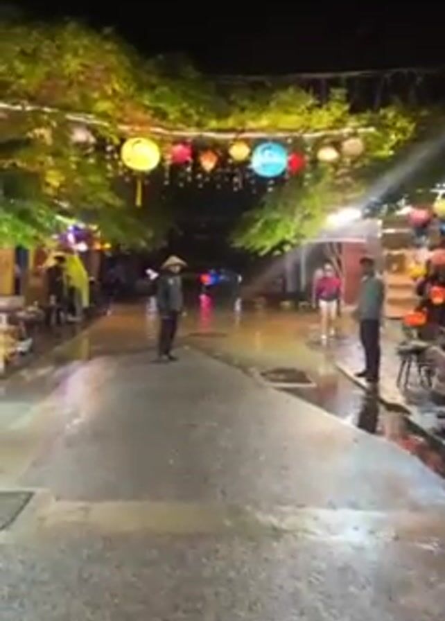At night, a street scene under decorative lanterns shows flooding, as the road is covered in water