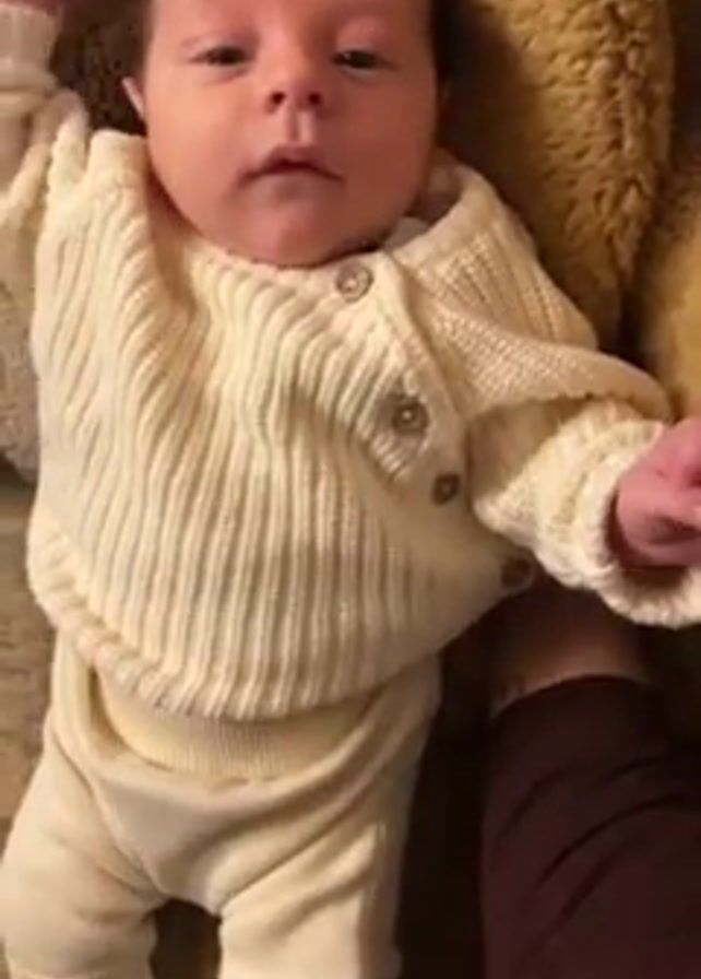 A baby lies on a tan textured blanket, wearing a white ribbed cardigan with three light brown buttons, white pants, and white socks. The baby is looking directly at the camera. A person wearing a dark burgundy sleeve is on the right, touching the baby.