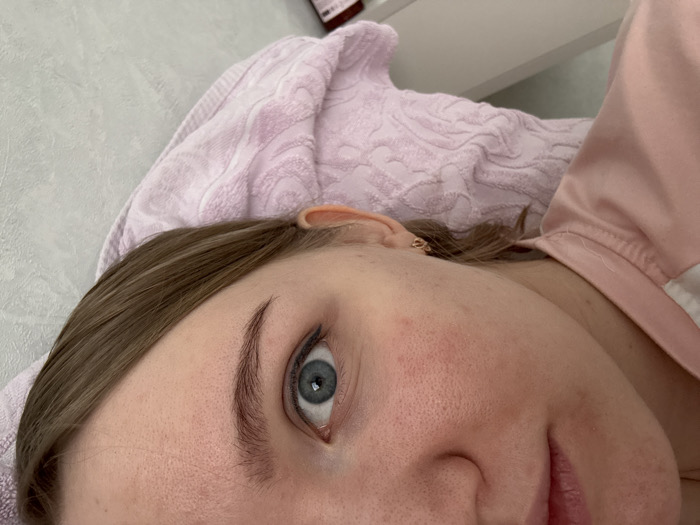 The image displays a close-up, angled view of a female individual's face, specifically focusing on her left eye and eyebrow. The subject is oriented on her back or side, with her head resting on a light pink, textured towel or blanket. Her left eye is open, revealing a blue iris with a dark pupil, and features a defined black winged eyeliner on the upper lid. The left eyebrow is dark and sharply shaped, consistent with a recent cosmetic procedure such as microblading or tinting. The skin around the eyebrow and on the visible portion of her cheek exhibits minor redness and visible pores. Light brown hair strands are visible near her left ear, which has a small gold-colored hoop earring. She is wearing a light pink garment, possibly a top or sweatshirt, partially visible on her upper body. In the blurred background, a light grey textured wall and a white surface, possibly a shelf or table, are visible, along with a dark bottle featuring a red label. The scene is located indoors in the city of Nizhnekamsk, Russia.