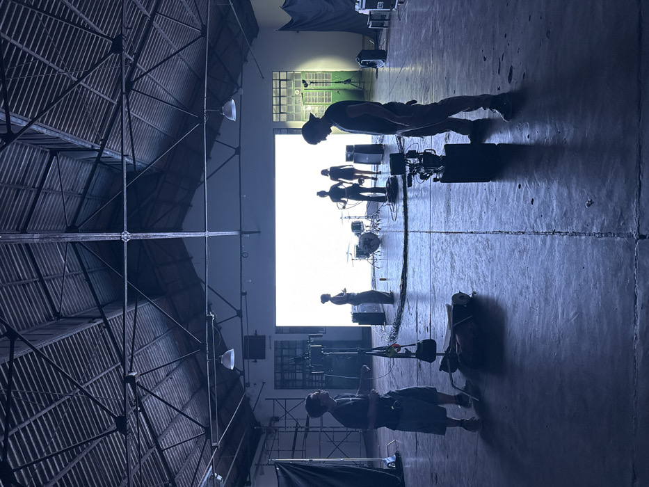 A wide-angle interior shot depicts a large, high-ceiling industrial space, possibly a warehouse or studio. The roof features corrugated metal sheeting supported by dark structural trusses. The concrete floor exhibits a dark, bluish-grey hue with visible seams and patches. At the far end of the space, a large, bright white rectangular background is present, illuminating four silhouetted figures. These figures are arranged around a drum kit positioned on a circular mat or marking on the floor. Two speaker cabinets are also visible near the figures. Numerous cables are coiled on the floor in front of the white background. To the right of the white background, a section of gridded windows and a dark green door or frame are discernible. Dark fabric backdrops on stands are partially visible on both the far left and far right sides of the overall scene. Two white pendant light fixtures hang from the ceiling. In the dimly lit foreground, two male individuals are positioned, facing the bright background. On the left, a male in a dark t-shirt and shorts stands next to a light stand or boom pole, from which a small, multicolored bag is suspended. A rolled-up mat or fabric lies on the floor near his feet. On the right, a male wearing a dark t-shirt, pants, and a baseball cap stands behind a professional video camera mounted on a black pedestal, appearing to look down at its monitor. Additional equipment cases and various cables are visible on the floor in the foreground and midground. The scene portrays a professional production setup.