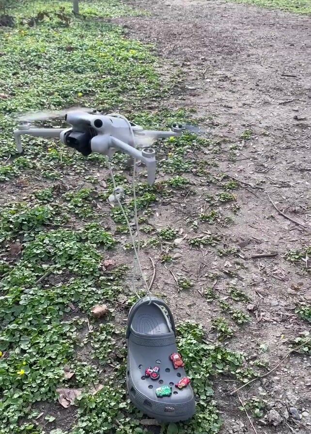 A drone attempts to lift a gray Croc sandal with Jibbitz charms off the ground