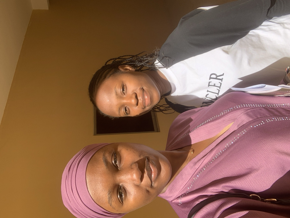 Two women pose indoors with a wall in the background. The woman in the foreground wears a lilac headscarf and a matching top adorned with rhinestones. A delicate gold necklace is visible. Behind her, the second woman sports cornrow braids and a white T-shirt with black sleeves and the word "MONCLER" printed on it. Papers are visible between the two women. Bright sunlight illuminates the scene, casting shadows and highlighting the textures of the clothing.