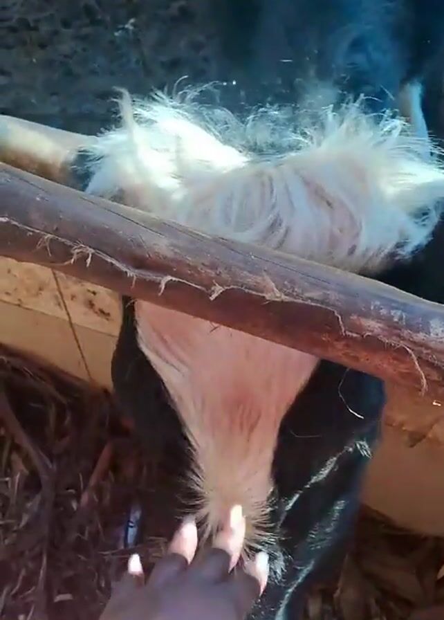 A person is seen petting a black and white goat inside a wooden structure, likely a pen. The person's hand is dark-skinned and moves from the goat's chest to its neck and ear area. The goat is standing near a wooden barrier, possibly eating. The pen floor is covered with hay or some kind of bedding. A second goat is visible behind the first.