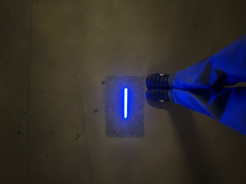 A top-down shot captures a dull-brown surface. In the center, a rectangular stone tile emits a vibrant blue, vertical light streak. To the right, the lower portion of a person is visible, wearing dark-soled shoes and bright blue pants. The illumination from the tile casts a dim glow on the shoes and pants, creating a surreal contrast between the artificial light and the darker surroundings.