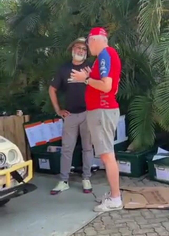 Two men are standing and talking outdoors. One man is wearing a hat, black t-shirt, and grey pants, and has a beard. The other man is wearing a red shirt, grey shorts, and a red cap. They appear to be discussing something, with the man in the red shirt pointing to something on his watch. They are surrounded by boxes, papers, and what looks like the front of a vehicle. Palm trees are visible in the background.