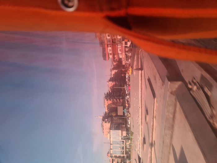 The image depicts an urban cityscape in Sarouja Municipality, Syria, viewed from inside a vehicle, with a prominent orange interior element on the right side of the frame. The foreground is dominated by an out-of-focus, vertically oriented, bright orange fabric object, likely a strap or curtain, occupying approximately one-third of the right side, featuring a visible silver metallic rivet or button. Below this, in the lower left, is a concrete structure comprising multiple stepped levels and flat surfaces, with some corrugated metal debris resting on the lowest visible level. Beyond this plaza-like area, a street is visible, populated by numerous vehicles including several yellow taxis and other cars, appearing to be parked or in slow traffic. A dense collection of multi-story buildings forms the background, characterized by light-colored facades (tan, beige, reddish-brown). A distinctive, slender minaret-like tower rises above one of the central buildings. To the far left, a modern building with a facade of large glass windows is visible. The buildings feature numerous windows and some visible rooftop fixtures. Sparse green foliage is discernible among the buildings. The sky overhead is clear and light blue, with a subtle pinkish-red reflection or tint visible, particularly towards the right side, likely influenced by the orange foreground object or atmospheric conditions. The scene is illuminated by natural daylight, suggesting late morning or afternoon. No specific individuals are clearly identifiable.