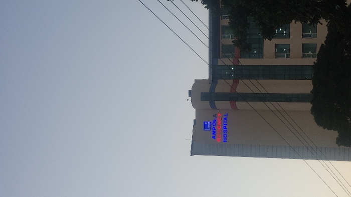 A vertical, low-angle view captures a tall building with "AMPOLA REGENCY HOSPITAL" signage