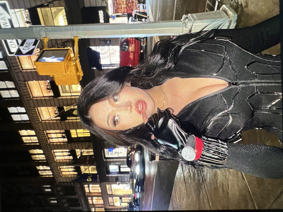 - "A woman in a black, low-cut, webbed bodysuit with black gloves and a red and silver wristband stands on a city street" by FM-sj2l93, licensed under CC BY 4.0