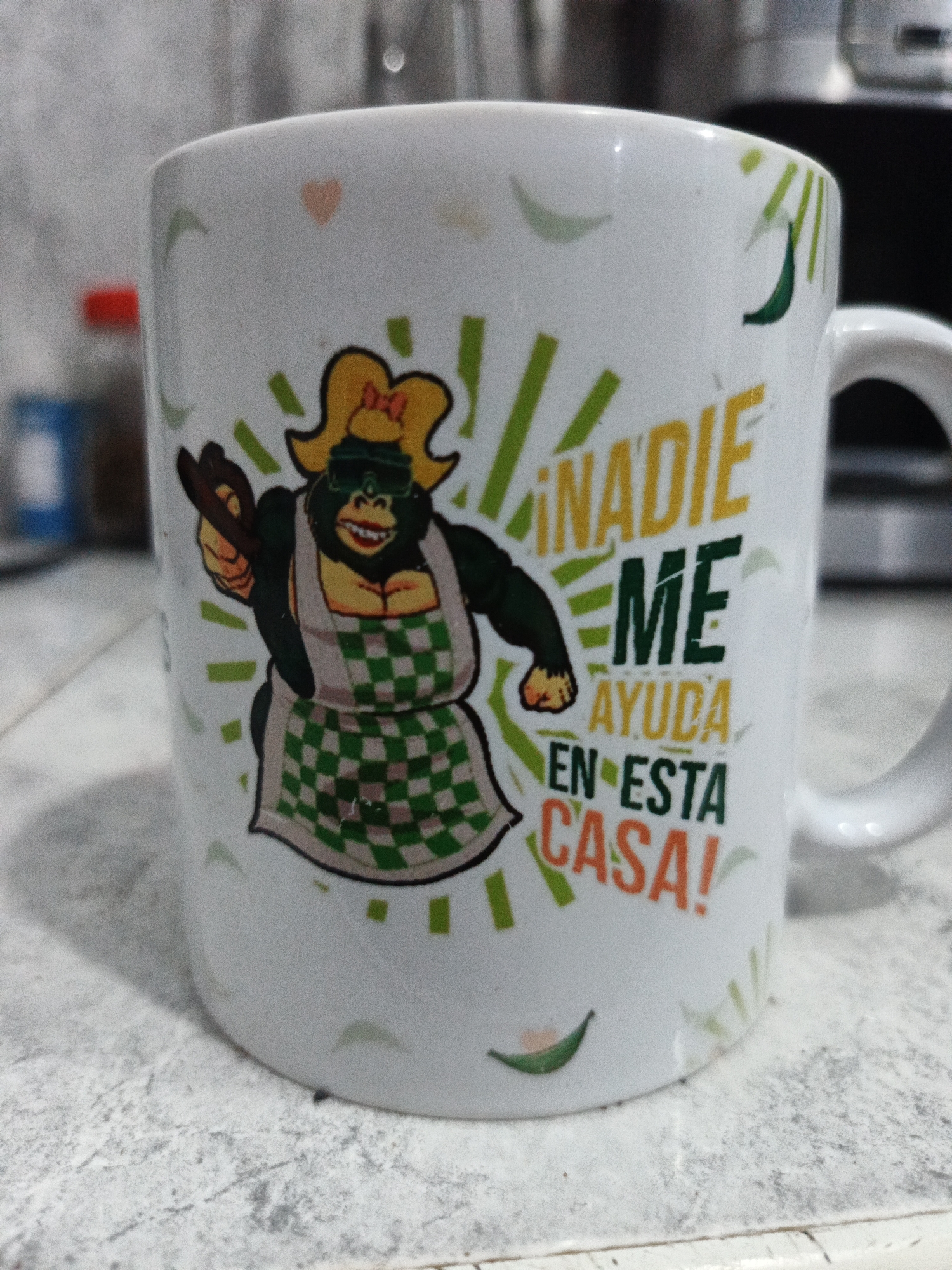 A white ceramic mug sits on a textured surface resembling a countertop. The mug has a cartoon image of a gorilla dressed as a housewife, wearing a blonde wig with a red bow, sunglasses, and a green and white checkered apron. The gorilla is holding a spatula. To the right of the image are the words "¡NADIE ME AYUDA EN ESTA CASA!" in yellow, green, and orange lettering. The mug is surrounded by a blurry background featuring kitchen items, including a container with a red lid. The scene appears to be in a domestic setting. There is no information about the city of Tinaco, Venezuela in the image.