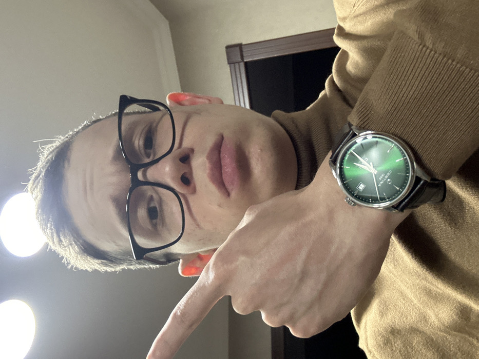 An indoor, eye-level portrait features a young male subject in Tashkent, Uzbekistan. He wears black-framed glasses and a light brown turtleneck sweater. His left hand is raised, with the index finger extended and pointing upwards to the left. A silver-cased Certina wristwatch with a green dial and dark leather strap is visible on his left wrist, displaying the number '1' in its date window. The subject's mouth is slightly ajar, and his gaze is directed towards the camera. The background consists of a light-colored wall, with two bright, circular ceiling lights in the upper left and a dark brown door frame or furniture edge in the upper right.