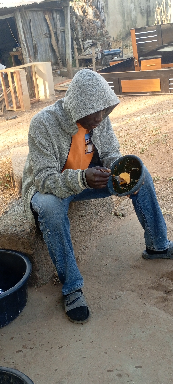 A person in a grey hooded sweatshirt, blue jeans, and black Nike sandals, is sitting on a stone. They are holding a black bowl with food and using a spoon to eat. An orange t-shirt is visible beneath the sweatshirt. There are black containers, unfinished wooden furniture, and a building with a corrugated metal roof in the background. The setting is outdoors with a rough, possibly dirt, surface.