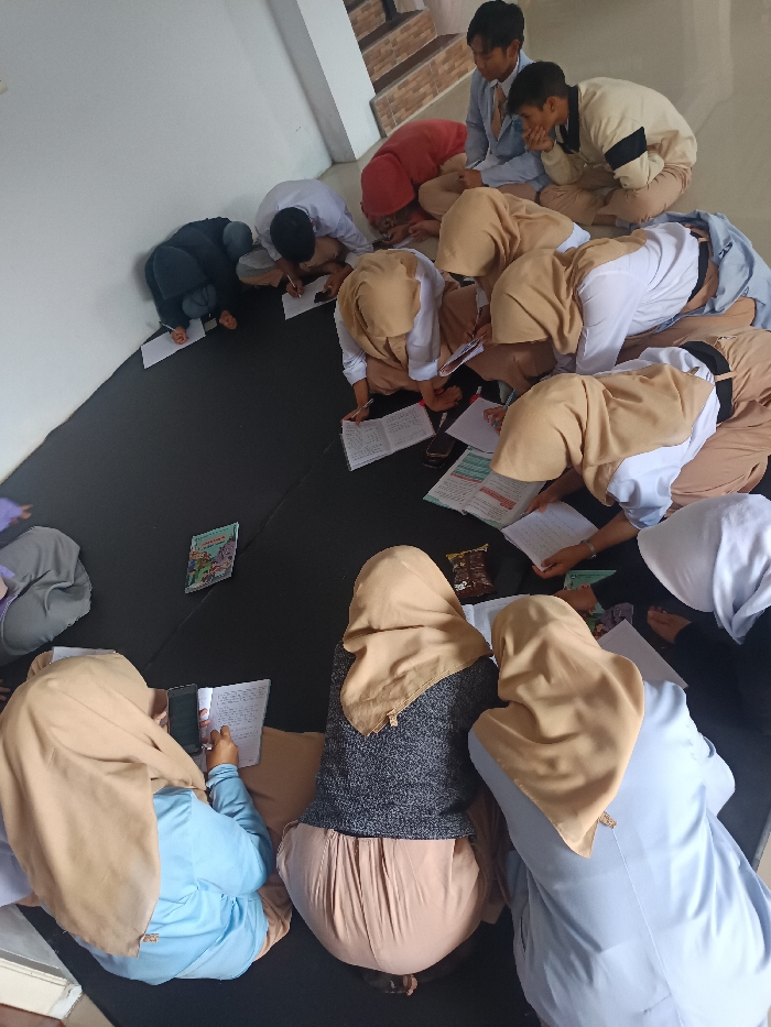A group of students sits on a black mat, appearing to study or take a test. They are bent over books and papers, writing. Some wear hijabs in shades of tan and white. The scene is indoors, possibly a school setting. One student wears a red hijab, while a few young men are in light-colored jackets. There is a book and a packet of snacks scattered nearby.