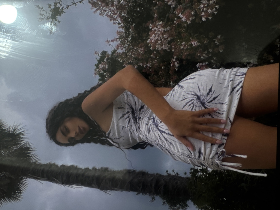 A female subject with long, dark, curly hair is depicted in an outdoor setting in Yerevan, Armenia. She is wearing a form-fitting, sleeveless mini-dress that features a white base with a blue and purple radial tie-dye pattern, and ruched detailing with visible drawstrings on the left side. Her right hand is placed on her left hip/buttock area. The image is captured from a low angle, with the subject looking directly at the camera. To the left, a tall palm tree trunk rises vertically. To the right, a flowering bush with light pink blossoms is visible. The sky is overcast and grey, with a distinct circular specular reflection present in the upper right portion of the frame. The specific location within Yerevan is an outdoor natural area, likely a park or garden, and cannot be further identified from the provided visual information.