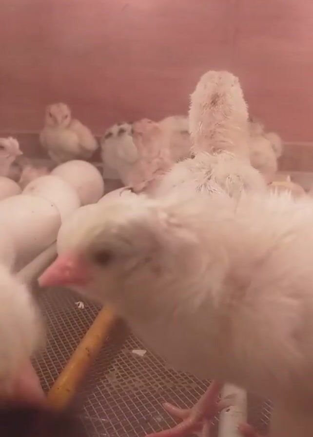 several fluffy, light-colored chicks in an enclosed area. Some are actively pecking at what appears to be a yellow stick-like object on a wire mesh surface. There are several white eggs lying on the mesh around the chicks. The enclosure appears to be small with red walls.