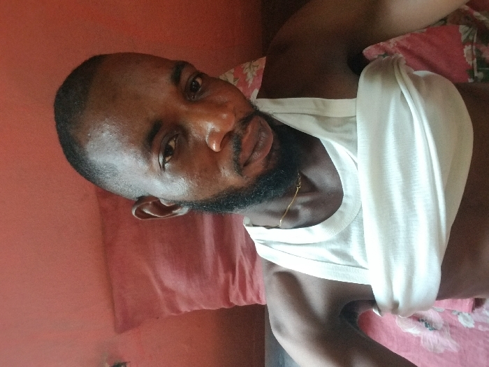 A dark-skinned man with a beard and a gold chain around his neck is lying down, seemingly on a bed