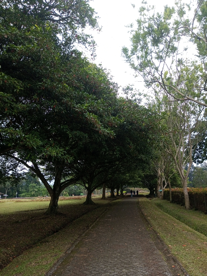 A shaded, paved path leads into the distance, lined by mature trees on either side