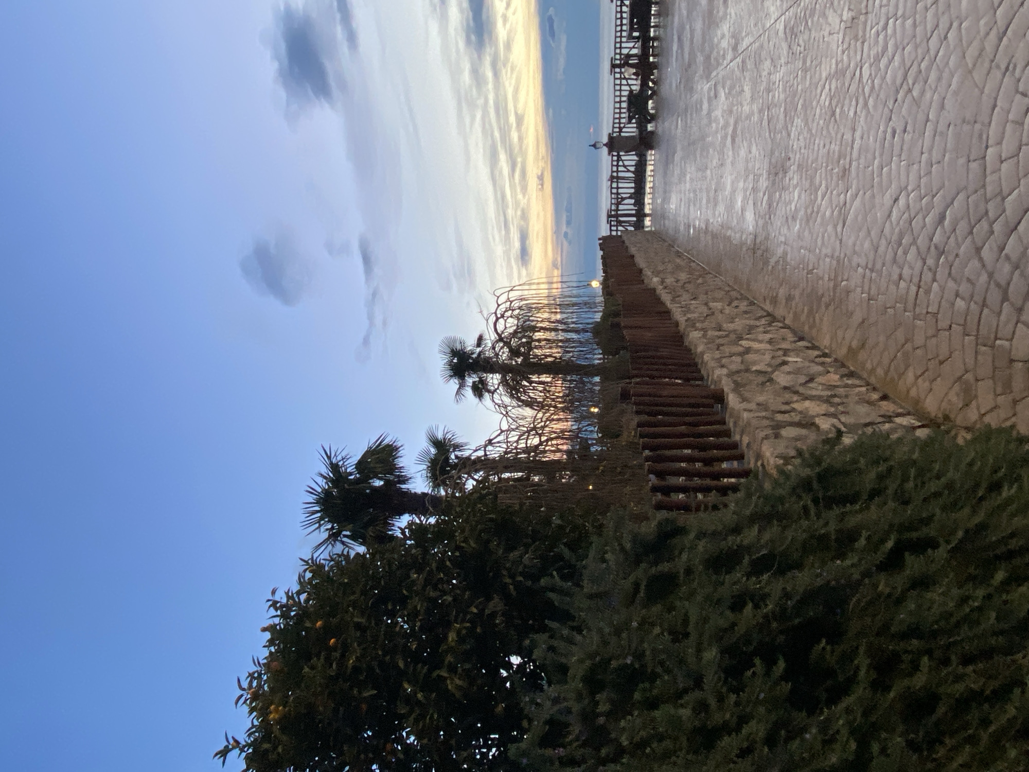 The image depicts an outdoor scene in Kovačko Polje, Montenegro, near dusk. A stone-paved promenade stretches into the distance, terminating at a pier with railings. The sky exhibits a gradient from blue to a band of orange and yellow at the horizon, indicating sunset or sunrise. A stone wall with wooden benches runs along the side of the promenade, bordered by vegetation, including trees and bushes. The overall lighting is dim, suggesting the time of day is early morning or late evening. There are no people visible.