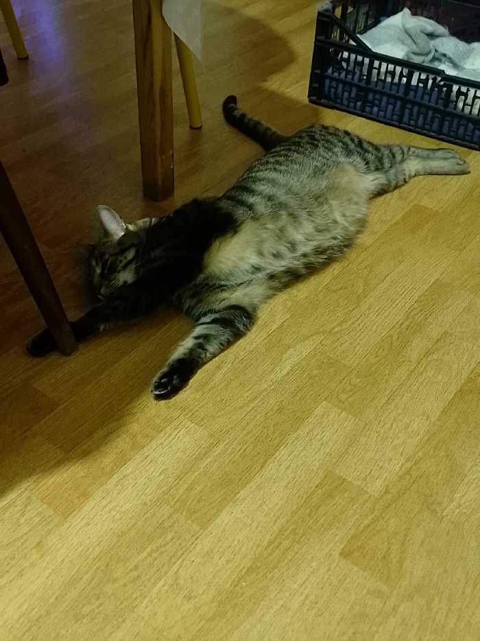 - "A tabby cat lies stretched out on a wooden floor, its body angled away from a table leg and towards a black plastic crate" by FM-5n8Vg2, licensed under CC BY 4.0