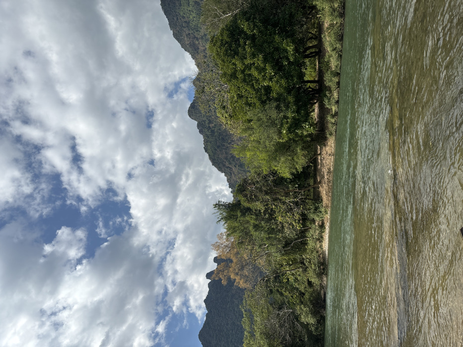 A river dominates the scene, its murky water reflecting light. The riverbank is lined with lush green trees, transitioning into rugged mountains. Fluffy white clouds fill the sky, contrasting with patches of clear blue. The landscape evokes a sense of wilderness and natural beauty.