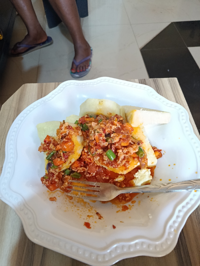 The scene depicts an indoor setting in Gura Top, Nigeria. In the foreground, a white, scalloped-edge plate holds a meal consisting of light-colored, rectangular pieces of what appears to be boiled yam or similar tuber, topped with a reddish-orange scrambled egg and vegetable stew containing visible green beans and red fragments. A silver-colored metal fork rests on the lower right side of the plate, partially submerged in the stew, which has also splattered onto the white plate surface. The plate sits on a light-brown wooden table with a visible grain. In the background, two sets of human feet with dark skin are visible on a tiled floor. One pair of feet wears purple flip-flops, with red-painted toenails on the visible foot, and is positioned near the lower center. The second pair of feet, partially obscured, wears dark flip-flops and is situated further back and to the left. The floor features large white tiles interspersed with black geometric patterns.