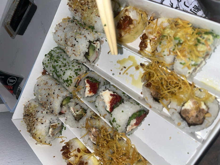 Sushi rolls in a divided container. One section features rolls topped with seeds, another with herbs. A roll with what appears to be sun-dried tomato is also visible. The final section has rolls with crispy fried onion-like toppings and a sauce. Wooden chopsticks are placed near the rolls. A small container of soy sauce sits nearby.