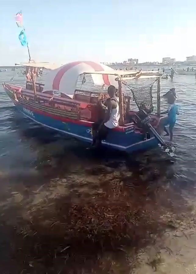 colorful boat with a striped canopy anchored near a beach. A man in a white tank top sits on the side of the boat, while another person stands near the boat's motor. The water is shallow and has a lot of seaweed near the shore. In the background, there are many people wading and swimming in the water. The sky is clear and blue.