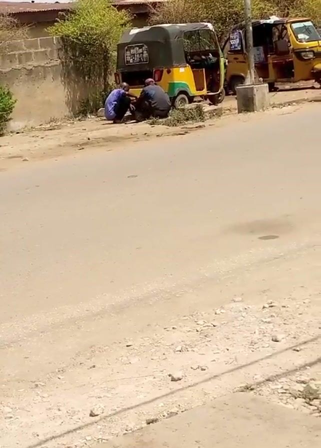 street scene in daylight. Two men are crouching near a parked yellow and green auto rickshaw, seemingly working on something. Another yellow auto rickshaw is parked nearby. A man rides a red motorcycle on the road, passing by the two men and the rickshaw. The road appears to be paved but somewhat dusty. There is a low wall bordering the street and some greenery in the background. A utility pole stands near the parked auto rickshaws.