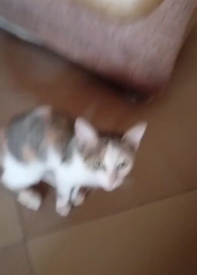 - "A calico cat is seen on a brown tiled floor, in front of a couch, meowing" by FM-yAvQc2, licensed under CC BY 4.0