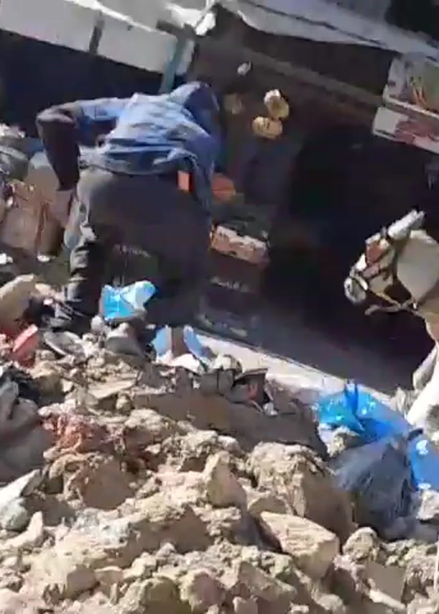 - "scene in what appears to be a town or city with a large pile of rubble, rocks, and trash bags in the foreground" by FM-V8KrL2, licensed under CC BY 4.0