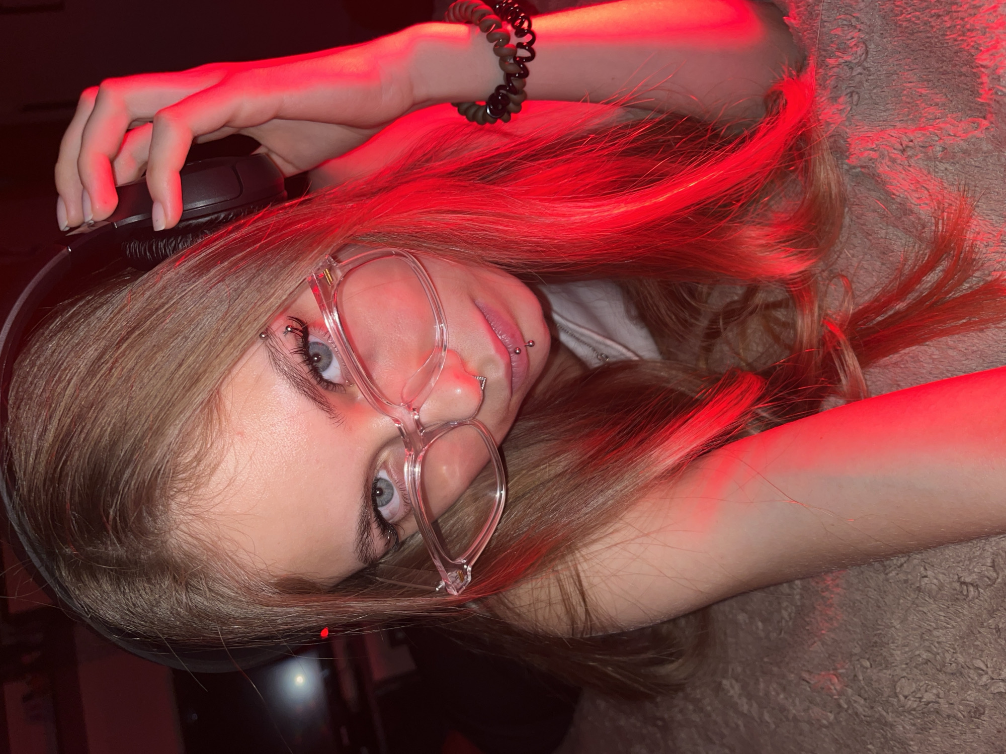 A young person with blonde hair and light skin is pictured with the image rotated counter-clockwise. The person is wearing clear-framed glasses and has piercings on their lip and eyebrow. They are holding black headphones. A bracelet is on their arm. The person is illuminated by a red light. The setting is indoors, with a textured surface, potentially a blanket or upholstered item, in the background. There is no visible evidence to suggest a location in the city of Фоки, Russia.