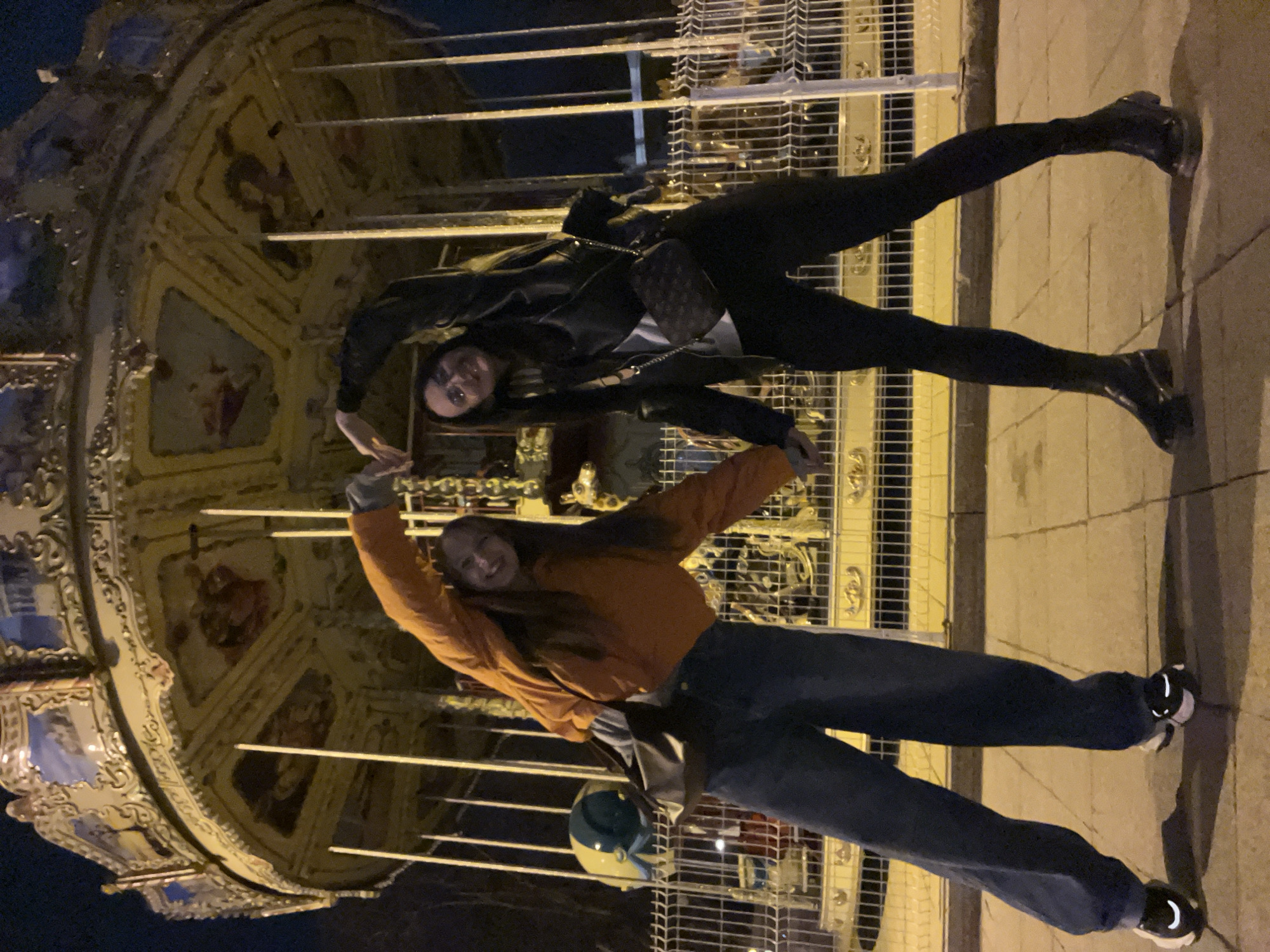 Two women are standing in front of an ornate carousel at night