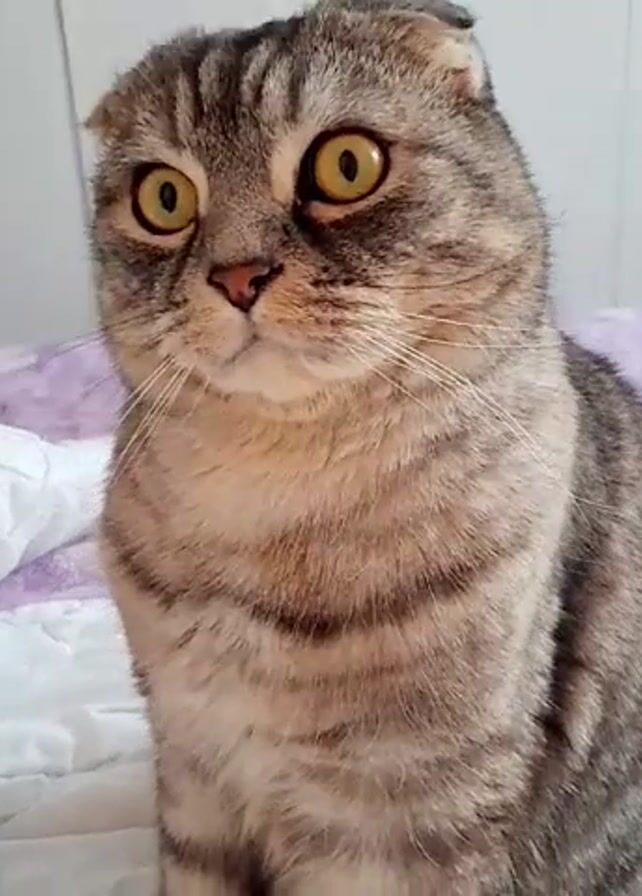 - "A medium shot shows a gray and black tabby Scottish Fold cat sitting on a bed" by FM-FrnGi2, licensed under CC BY 4.0