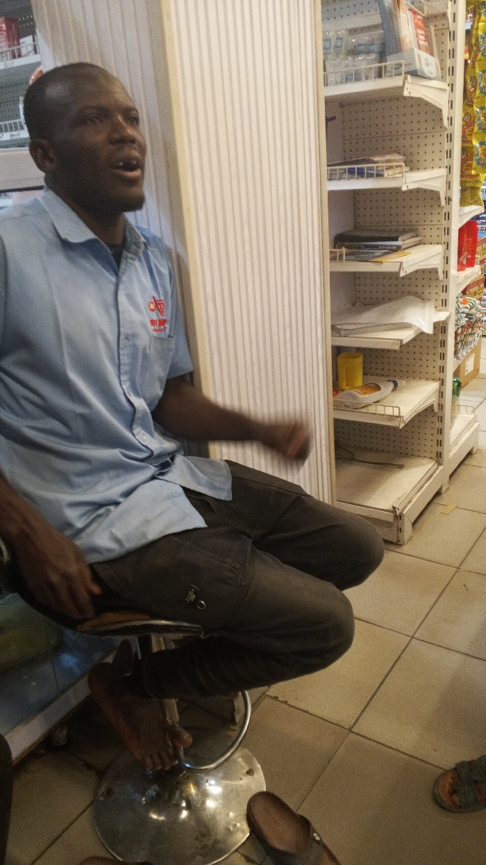 An adult male is seated on a chrome-plated bar stool inside a retail establishment in Tarauni, Nigeria