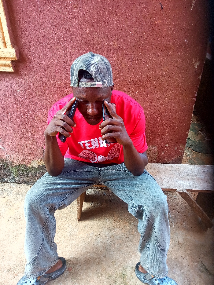 A single male individual is seated against a reddish-brown textured wall at Akpaka Forest Reser, Nigeria. He wears a backward-facing camouflage baseball cap, a red t-shirt with a white "TENNIS" graphic, light-colored jeans, and dark clogs. His head is tilted downwards, and he holds one dark-colored smartphone against each temple. The individual is positioned on a simple wooden stool or bench, partially visible. The ground is an unpaved, light brown surface. A section of yellowish-ochre trim is visible on the wall to the left.