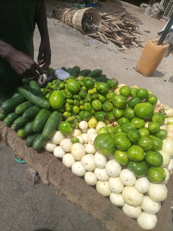 An outdoor market scene in Gulum, Nigeria, displays an array of fresh produce. A vendor, visible from the chest up and wearing a dark top, extends their left hand over a black plastic bag containing dried fish, situated atop a display of vegetables. The produce is arranged on a coarse, woven fabric spread on the ground. To the left, a pile of green cucumbers, some with visible moisture, is present. In the center, a large collection of small, irregular-shaped green vegetables, consistent with garden eggs, is visible. To the right, numerous round, white vegetables, also resembling garden eggs, are piled. Another cluster of round to oval-shaped green, striped vegetables is positioned on the far right. In the background, an unpaved ground surface is visible. A large, horizontally oriented woven basket lies behind the produce, alongside a significant pile of cut wooden sticks or branches. A faded yellow plastic jerrycan stands upright on the right, partially obscured by a motorcycle tire and frame visible behind it.