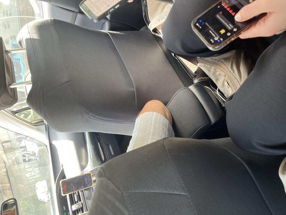 interior of a car. There are three people in the car, one in the driver's seat, one in the passenger seat, and one in the backseat. The person in the driver's seat is partially obscured by the camera. The person in the passenger seat has their arm resting on the center console. The person in the backseat is holding a smartphone and is looking at it. The car is parked in a parking lot in Saint-Denis, France, which is located at latitude: 48.932, longitude: 2.37. A phone is mounted to the dashboard, and another phone is mounted on the headrest of the seat in front of the person in the backseat. There is a purse between the person in the backseat and the front passenger. The interior of the car is black leather. The windows are tinted. A car is visible outside the window. The view through the windshield shows a brick wall. There is some graffiti on the wall. The sun is shining brightly, and the interior of the car is well lit.