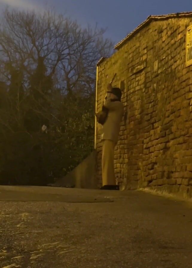 A person stands in a poorly lit, outdoor setting at night. The person wears a light-colored suit and dark shoes. Their head is covered. They appear to be playing a stringed instrument, possibly a guitar, while leaning against a brick wall. A tree without leaves is visible in the background. The ground is paved and has an uneven surface. A sign is affixed to the brick wall. The sky is dark, suggesting either dusk or dawn.
