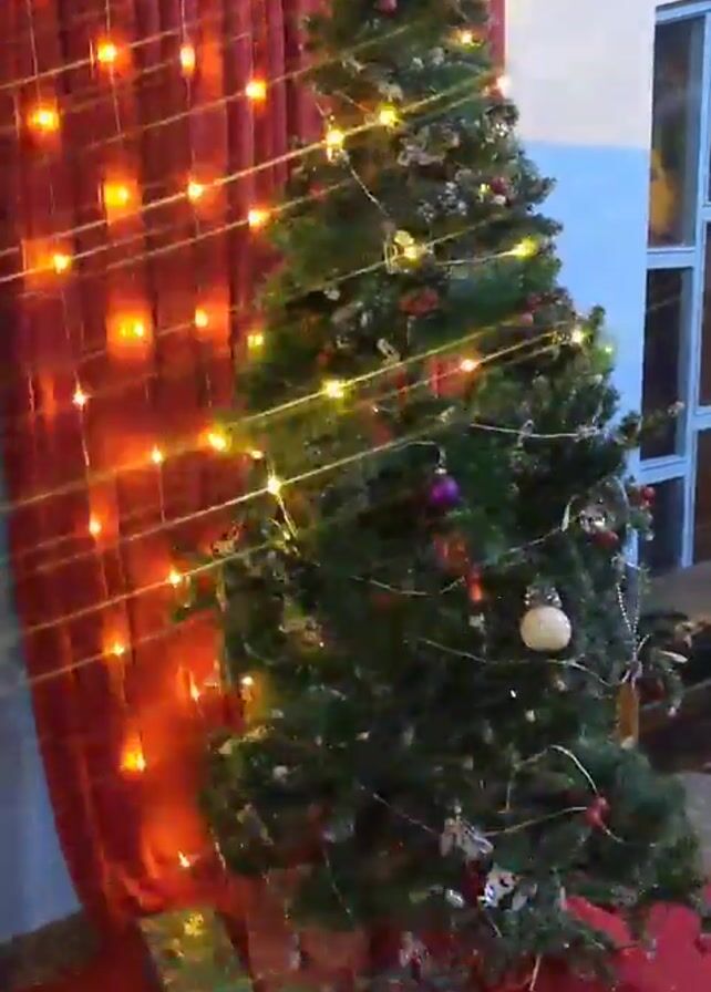 decorated Christmas tree in a room. The tree is adorned with lights and ornaments, and there are wrapped gifts at its base. A red curtain with hanging string lights is behind the tree. A window can be seen in the background to the right of the tree. The scene is festive and warm.